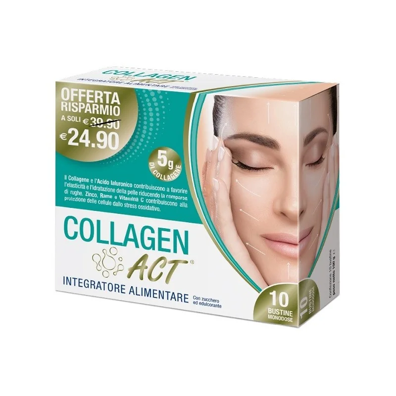 Collagen ACT è un integratore di collagene idrolizzato, acido ialuronico, Vitamina C, Zinco e Rame, favorisce l'elasticità, l'idratazione e riduce i segni dell'invecchiamento.