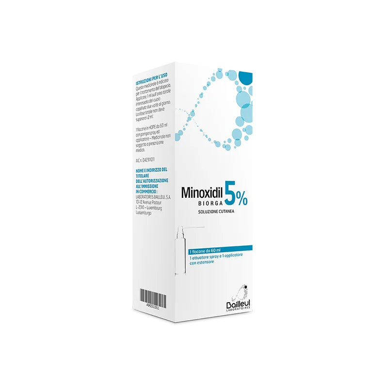 Minoxidil Biorga 5%, soluzione cutanea è un medicinale in forma liquida, da applicare direttamente sul cuoio capelluto. Si usa come trattamento per la perdita dei capelli e non come una cura. Il minoxidil è un vasodilatatore periferico, il cui esatto meccanismo di ripristino della crescita dei capelli non è noto.