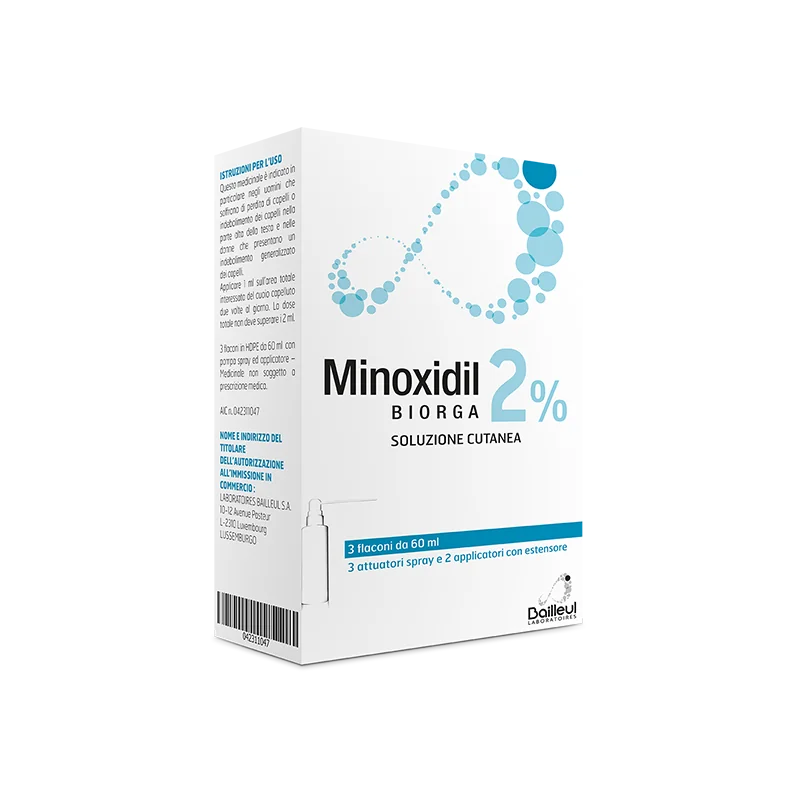Minoxidil Biorga 2%, soluzione cutanea è un medicinale in forma liquida, da applicare direttamente sul cuoio capelluto. Si usa come trattamento per la perdita dei capelli e non come una cura. Il minoxidil è un vasodilatatore periferico, il cui esatto meccanismo di ripristino della crescita dei capelli non è noto.