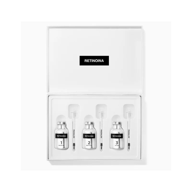 Retinoina Trattamento Intensivo, è formato da 3 sieri in flacone, ognuno dei quali contiene le molecole attive funzionali dei 3 complessi ottimizzati per agire sui fenomeni che si manifestano con l'età della pelle: rughe da crono- e foto-invecchiamento, rughe dinamiche, perdita di tono, compattezza e vitalità della pelle, ruvidità, macchie e grigiore.