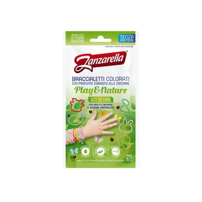 Coswell Zanzarella Braccialetti Play&Nature sono dei simpatici braccialetti colorati con profumo sgradito alle zanzare attivi fino a 12 ore. Dimensione unica per adulti e bambini. I braccialetti sono costruiti in silicone e a base di oli essenziali. Senza insetticidi. Resistenti all'acqua e attivi fino a 12 ore. I braccialetti hanno 5 diverse simpatiche forme di animali. Senza insetticidi.