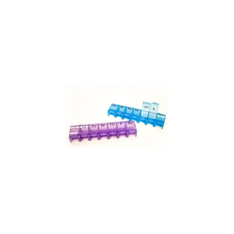 Suddiviso in 7 scomparti indipendenti, uno per ciascun giorno della settimana, con relative lettere iniziali del giorno corrispondente stampate su ciascuno scomparto.