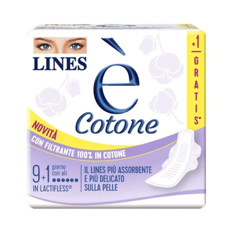 Lines è Cotone Assorbente Giorno con Ali è un prodotto per l'igiene intima che assorbe efficacemente le perdite garantendo freschezza e asciuttezza.