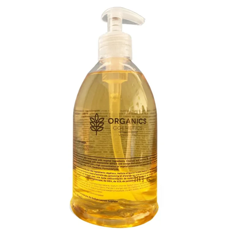aqua, cocamidopropyl betaine, sodium chloride, sodium cocoyl sarcosinate, cocamidopropyl hydroxysultaine, Citrus aurantium dulcis (orange) peel oil, Citrus nobilis (mandarin orange) peel oil, Chamomilla recutita (matricaria) flower extract, Malva sylvestris (mallow) flower/leaf extract, sodium sunflowerseedamphoacetate, benzyl alcohol, glycerin, lactic acid, sorbitol, potassium sorbate, sodium benzoate, limonene, citral, citronellol, linalool.