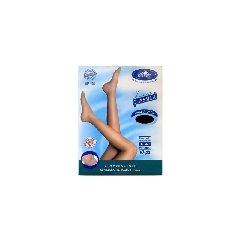 Calza autoreggente in maglia liscia, raffinata ed elegante, impreziosita da balze in pizzo e dotata di bande in silicone per una corretta aderenza alla gamba e un comfort elevato. Tallone rinforzato e punta elastica per una corretta vestibilità e un’elevata resistenza.