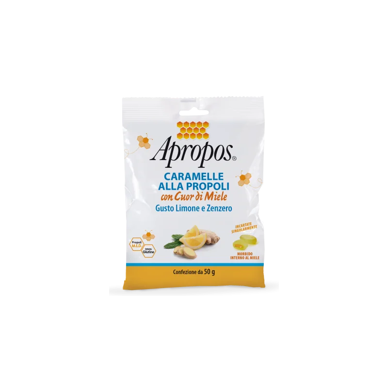 CARAMELLE ALLA PROPOLI CON CUOR DI MIELE AL GUSTO LIMONE E ZENZERO.