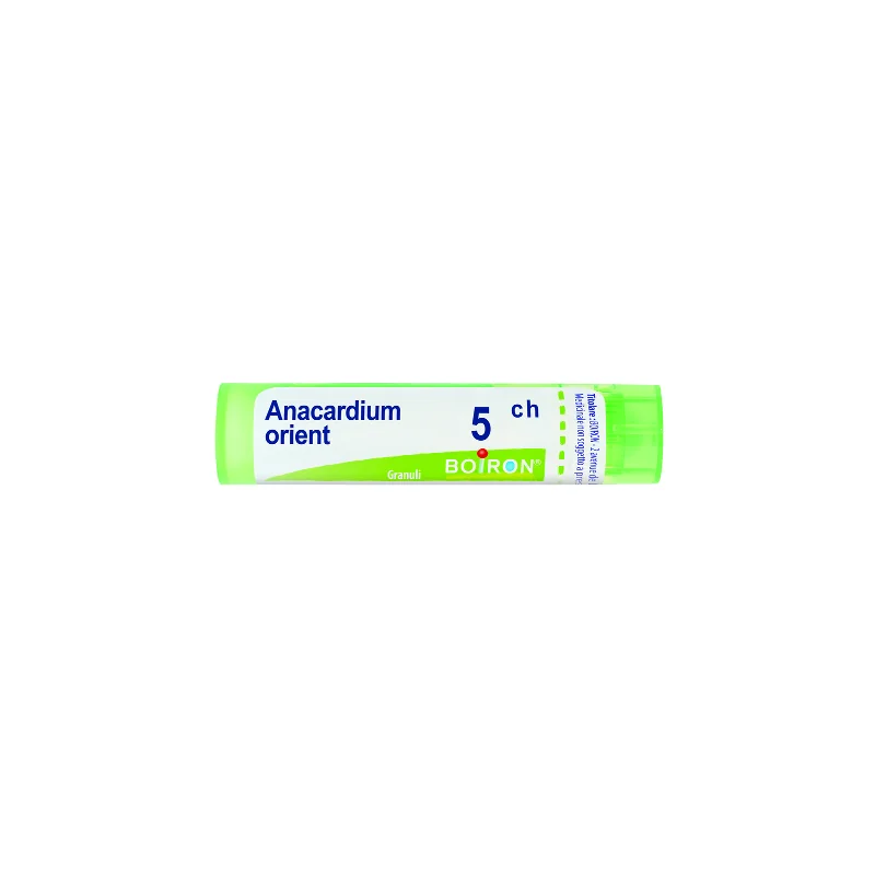 Boiron Anacardium Orientale 5CH granuli è un rimedio omeopatico preparato a partire dall' Anacardio, albero della famiglia delle Anacardiacee. La Tintura Madre si prepara dal frutto essiccato. I derivati fenolici contenuti sono responsabili dell'azione vescicolante.