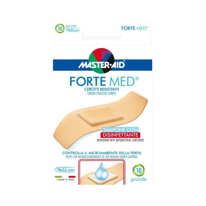 Dispositivo medico CE 0373. Cerotti in striscia a protezione elevata. Tampone con disinfettante (clorexidina digluconato). FORTE MED offre una elevata protezione della ferita dagli agenti esterni (sporcizia, batteri) grazie ad un supporto particolarmente resistente. FORTE MED grazie alla microperforazione consente la traspirazione della cute evitando processi di macerazione. L'adesivo ipoallergenico è particolarmente indicato anche per le pelli più sensibili.