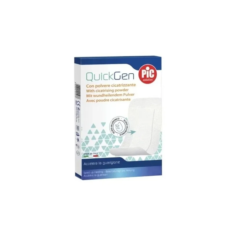 È un cerotto Pic con acido ialuronico che aiuta la cute a rigenerarsi velocemente e quindi a cicatrizzare prima. Protegge la ferita e ne accelera il processo di guarigione grazie all'acido ialuronico contenuto nel tampone. QuickGen è consigliato in caso di escoriazioni, abrasioni e scottature con essudato. L'azione dell'acido ialuronico crea un film protettivo stabile sopra alla ferita che rimane cosi, sempre protetta e ben idratata: queste tre caratteristiche permettono alla pelle di rigenerarsi prima, e alla ferita di guarire velocemente. Il supporto adesivo in tessuto-non tessuto permette alla pelle di respirare, inoltre il formato "a farfalla" per articolazioni consente a gomiti e ginocchia elevata mobilità - grazie al supporto elastico e ai bordi ergonomici. QuickGen è presente in 4 referenze con dimensioni e forme diverse (tra cui la pratica shape a farfalla per articolazioni), piu una versione mix con una referenza per tipo: così puoi prenderti cura di ogni ferita nel modo più adatto.