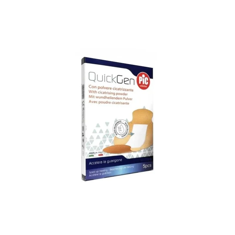 È un cerotto Pic con acido ialuronico che aiuta la cute a rigenerarsi velocemente e quindi a cicatrizzare prima. Protegge la ferita e ne accelera il processo di guarigione grazie all'acido ialuronico contenuto nel tampone. QuickGen è consigliato in caso di escoriazioni, abrasioni e scottature con essudato. L'azione dell'acido ialuronico crea un film protettivo stabile sopra alla ferita che rimane cosi, sempre protetta e ben idratata: queste tre caratteristiche permettono alla pelle di rigenerarsi prima, e alla ferita di guarire velocemente. Il supporto adesivo in tessuto-non tessuto permette alla pelle di respirare, inoltre il formato "a farfalla" per articolazioni consente a gomiti e ginocchia elevata mobilità - grazie al supporto elastico e ai bordi ergonomici. QuickGen è presente in 4 referenze con dimensioni e forme diverse (tra cui la pratica shape a farfalla per articolazioni), piu una versione mix con una referenza per tipo: così puoi prenderti cura di ogni ferita nel modo più adatto.