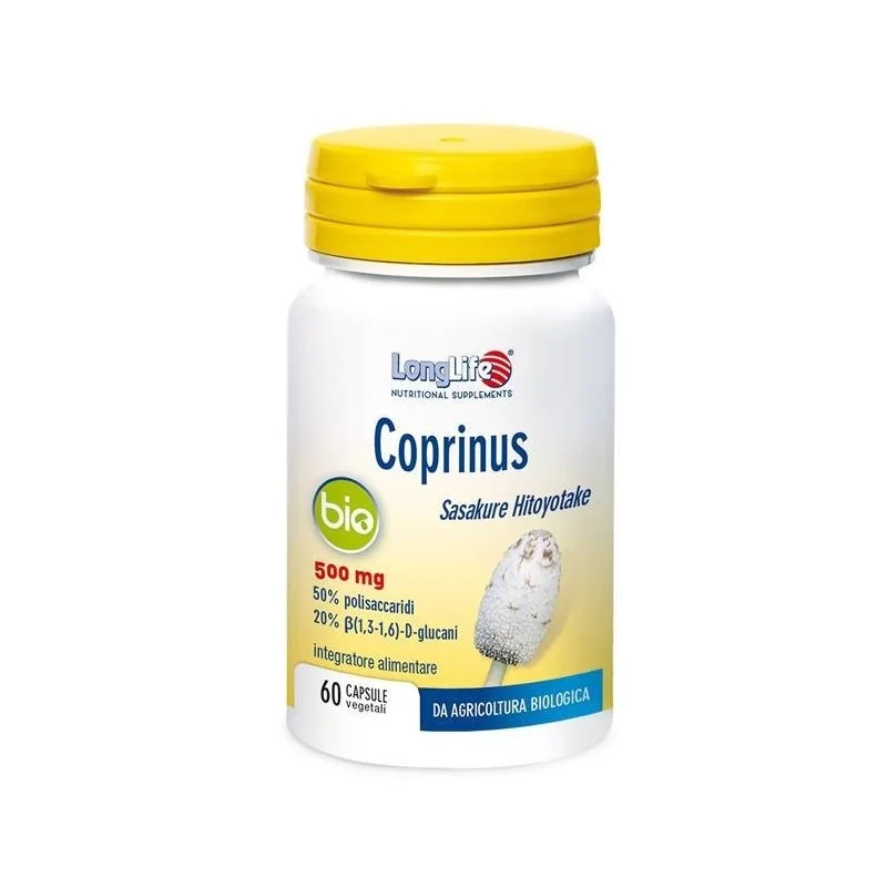 Longlife Coprinus Bio Integratore Metabolico è un prodotto alimentare a base di Coprinus comatus, un fungo molto comune, diffuso nelle zone settentrionali temperate, che cresce nelle stagioni piovose dalla primavera all'autunno. Utile al metabolismo glucidico e come aiuto per la sindrome metabolica con obesità addominale. Il prodotto inoltre svolge attività antiparassitaria, antiprotozoaria e antibatterica. Adatto a vegetariani e vegani. Senza glutine.