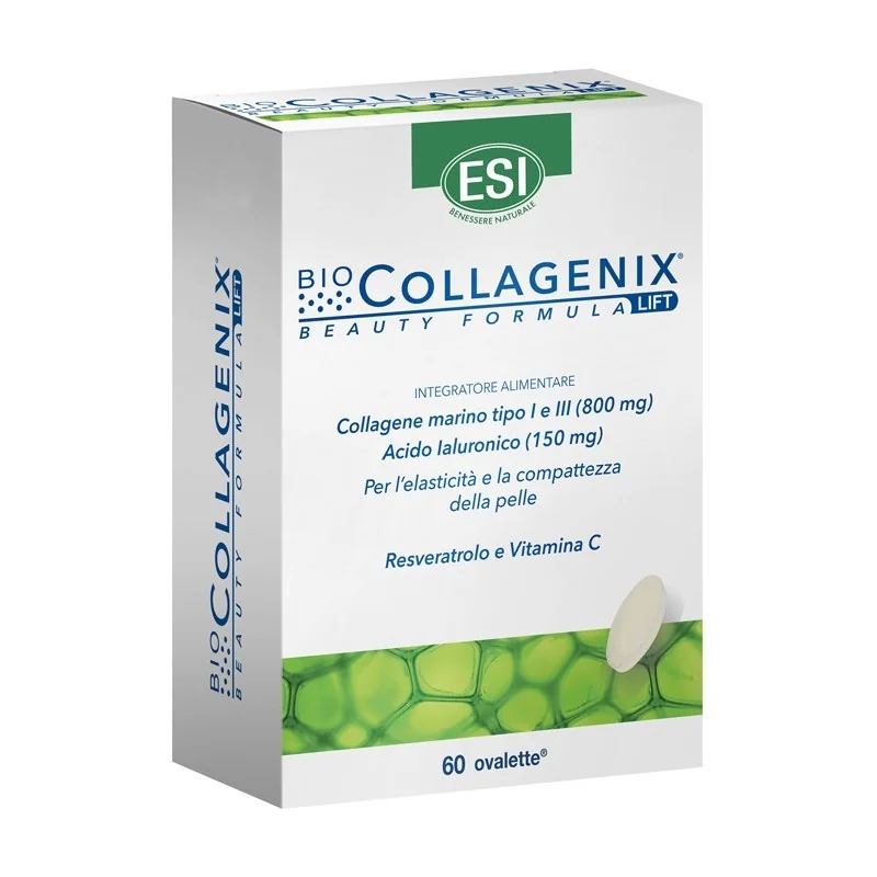 Integratore alimentare a base di collagene marino idrolizzato di tipo I e III altamente purificato, acido ialuronico, resveratrolo, vitamina C, rame e zinco. Il collagene, insieme all'acido ialuronico, contribuisce a mantenere l'elasticità e la compattezza della pelle. Biocollagenix è indicato per tutte le persone che vogliono prendersi cura della propria pelle e degli annessi cutanei (capelli e unghie), con un'azione di stimolo proveniente dall'interno dell'organismo. Ideale in caso di eccessiva esposizione al sole, per le persone che lavorano al chiuso e in locali climatizzati che disidratano la pelle e per le persone che non seguono una dieta corretta.