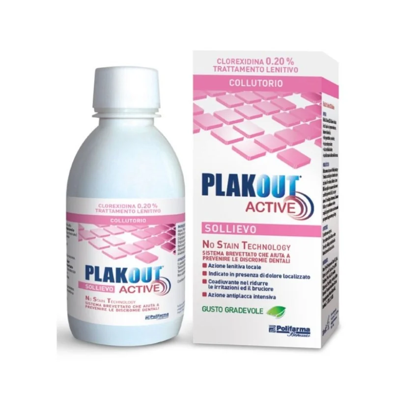 Plakout Active Sollievo Collutorio Antiplacca è un prodotto contente Clorexedina 0,20% in grado di contrastare la placca e prevenire la formazione di carie. Il collutorio è indicato per i portatori di protesi, impianti e apparecchi ortodontici, nei casi di parodontiti e prima e dopo un'intervento odontoiatrico. Grazie all’innovativo sistema NST (No Stain Technology) rallenta la comparsa e riduce l’incidenza delle pigmentazioni dentali, spesso conseguenza dell’uso della Clorexidina. PlakOut® Active è privo di alcool, così da evitare irritazioni della mucosa. Al gusto di menta.