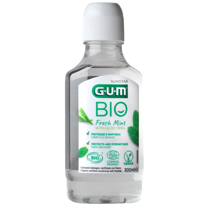 Collutorio biologico certificato con fluoro. In combinazione con il dentifricio GUM BIO ha azione antiplacca e protegge e rinforza denti e gengive.