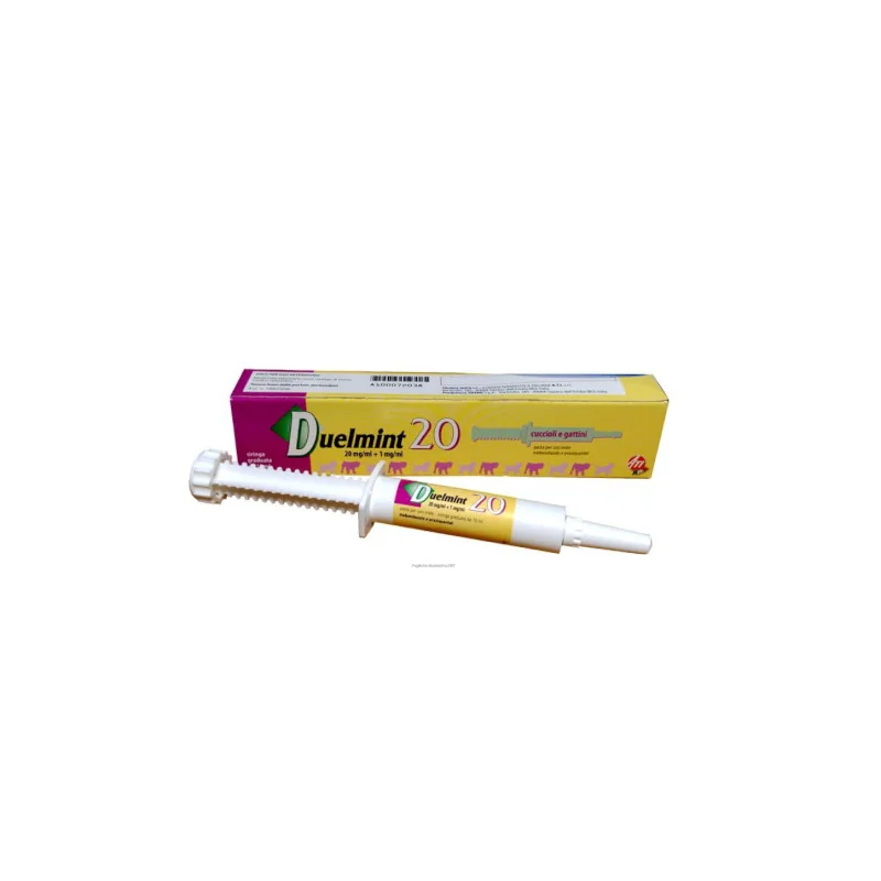 Va somministrato in cani e gatti alla posologia di 20 mg di mebendazolo/kg p.v. e di 1 mg di praziquantel/kg p.v. seguendo lo schema sottoriportato. DUELMINT 100 cani e gatti: 1 cc di pasta, pari ad 1 tacca della siringa, ogni 5 kg di peso vivo una volta al giorno per 3 giorni consecutivi. Una siringa e' sufficiente per il trattamento di 25 kg di peso complessivo in un ciclo di terapia. DUELMINT 40 cani di piccola taglia e gatti: 1 cc di pasta, pari ad 1 tacca della siringa, ogni 2 kg di peso vivo una volta al giorno per 3 giorni consecutivi. Una siringa e' sufficiente per il trattamento di 10 kg di peso complessivo in un ciclo di terapia. DUELMINT 20 cuccioli e gattini: 1 cc di pasta, pari ad 1 tacca della siringa, ogni kg di peso vivo una volta al giorno per 3 giorni consecutivi. Una siringa e' sufficiente per il trattamento di 5 kg di peso complessivo in un ciclo di terapia. Somministrare la pasta tramite siringa direttamente nella cavita' orale dell'animale, preferibilmente alla base della lingua. Non e' necessario il digiuno e la pasta puo' essere somministrata anche miscelata all'alimento. Per assicurare un corretto dosaggio il peso corporeo deve essere determinato nel modo piu' accurato possibile. Modalita' di somministrazione Il prodotto e' confezionato in tubi siringa provvisti di ghiera dosatrice e di stantuffo graduato in cui ciascuna tacca corrisponde ad un centimetro cubo (cc), equivalente ad 1 ml. A confezione integra la ghiera dosatrice e' posizionata all'estremita' dello stantuffo Per predeterminare con precisione l'esatta quantita' di pasta da somministrare e' necessario ruotare la ghiera dosatrice in senso orario. La ghiera va fermata a destra della tacca corrispondente al numero di cc desiderati, dopo di che, una volta tolto il tappo, e' sufficiente premere lo stantuffo fino a fine corsa. Per le successive somministrazioni, ruotare la ghiera in senso antiorario contando il numero di cc che si vogliono somministrare, e cosi' via fino allo svuotamento completo della siringa.