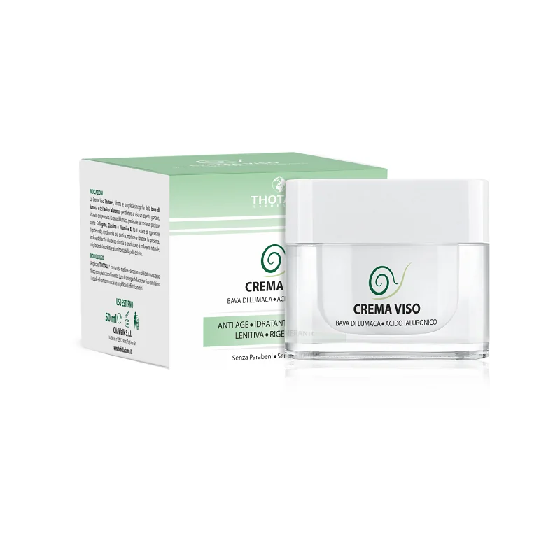 La Crema Viso Thotale sfrutta le proprietà sinergiche della bava di lumaca e dell'acido ialuronico per donare al viso un aspetto giovane, idratato e rigenerato. La bava di lumaca, grazie alle sue sostanze preziose come collagene, elastina e vtamina E, ha il potere di rigenerare l'epidermide, rendendola più elastica, morbida e idratata. La presenza, inoltre, dell'acido ialuronico stimola la produzione di collagene naturale, migliorando la tonicità e la luminosità della pelle del viso. Senza parabeni e senza paraffina.