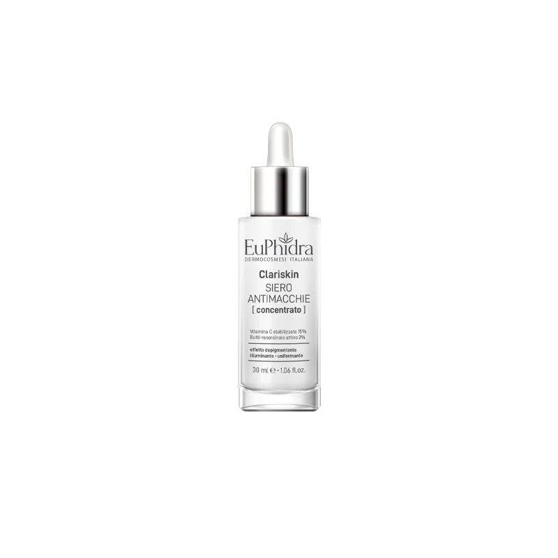 EuPhidra Clariskin siero antimacchie concentrato è scorrevole, illuminante e setoso. L’applicazione costante sulle discromie aiuta a ridurne le dimensioni e la visibilità, grazie alla presenza di ingredienti attivi in elevata concentrazione.