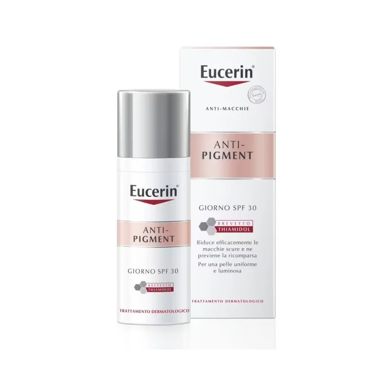 Eucerin Anti-Pigment Giorno SPF 30 contiene Thiamidol, un ingrediente efficace e brevettato che agisce alla base delle cause dell' iperpigmentazione riducendo la produzione di melanina. È stato clinicamente e dermatologicamente comprovato che riduce le macchie scure e ne previene la ricomparsa. I primi risultati sono visibili dopo solo due settimane e continuano a migliorare con l'utilizzo regolare. Con i filtri UVA e UVB (SPF 30) la crema idratante giorno offre una protezione efficace dal sole e riduce le possibilità di sviluppare le macchie causate dal sole. La pelle risulta più uniforme e luminosa.