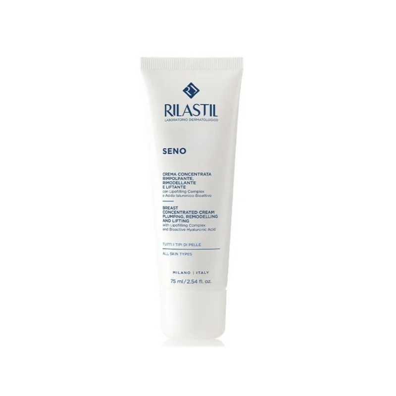 Rilastil crema seno è una crema idratante dalla texture leggera, per donare un effetto rimpolpante, liftante e rimodellante, a base di acido ialuronico e lipofilling complex. Effetto volumizzante ed elasticizzante. Ideale per tutti i tipi di pelle, in caso di perdita di tonicità, in particolare, dopo gravidanza ed allattamento.Testato dermatologicamente. Formulato con acido ialuronico, mentolo, pantenolo, aloe barbadensis, estratto della radice di ginseng ed attivi nutritivi come burro di karitè, olio d'oliva, olio di jojoba ed avocado. Senza nichel, cromo, palladio, mercurio e cobalto.