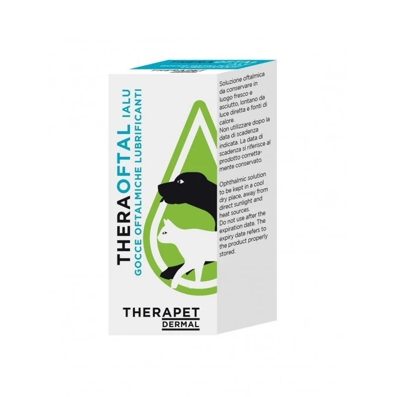 Theraoftal Ialu Gocce Oftalmiche Lubrificanti è una soluzione oftalmica sterile con acido ialuronico cross-linkato e carbossimetil beta-glucano in grado di proteggere, idratare e lubrificare la superficie oculare di cani e gatti per diverse ore. Theraoftal Ialu è indicato in tutti i casi di possibile alterazione del film lacrimale eventualmente anche con secchezza oculare, perché provvede a idratare, proteggere e lubrificare la superficie dell’occhio.