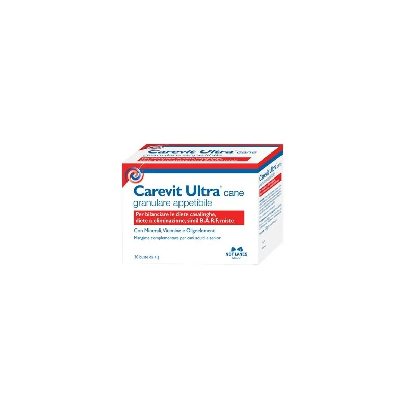 Carevit Ultra cane è un mangime complementare per cani in granulare appetibile, formulato rispettando le linee guida FEDIAF ed i riferimenti NRC, con minerali, vitamine e oligoelementi essenziali per bilanciare la dieta casalinga del cane adulto e anziano, le diete ad eliminazione, le diete a base di carne e/o frattaglie senza cereali (simil B.A.R.F. senza ossa), le diete miste (commerciale + casalinga : quando la dieta casalinga apporta più del 50% del fabbisogno energetico).