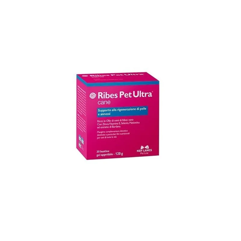 Ribes Pet Ultra gel appetibile è un mangime complementare dietetico destinato a particolari fini nutrizionali per cani di taglia medio-grande, ad elevata concentrazione di acidi grassi essenziali e con estratto di bardana e vitamina E, come supporto della funzione dermica in caso di dermatosi ed eccessiva perdita di pelo. L'apporto dietetico di acidi grassi polinsaturi w-6 e w-3 favorisce la normale funzionalità della barriera cutanea. Ricco in olio di ribes nero a elevata concentrazione di acidi grassi essenziali con estratto di bardana e vitamina E.