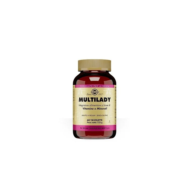 Solgar Multilady Integratore Femminile è un prodotto dalla formulazione all'avanguardia, studiata appositamente per le donne, particolarmente completa e ricca di vitamine e minerali. Le Vitamine B1, B3, B6, B8, B9, B12 e C contribuiscono alla normale funzione psicologica. Le Vitamine B6, B12 e acido folico sono inoltre essenziali per favorire il fisiologico metabolismo dell'omocisteina, molecola considerata il "nuovo colesterolo". La vitamina C contribuisce alla normale formazione di collagene per la normale funzione di pelle, ossa e cartilagini. Lo zinco contribuisce al mantenimento di pelle normale e insieme al selenio contribuisce al mantenimento di unghie e capelli in salute. Le vitamine B2, B9, C, E, lo zinco, il manganese, il rame e il selenio contribuiscono alla protezione delle cellule dallo stress ossidativo. Le vitamine B6, B12, C, D, lo zinco, il ferro e il rame contribuiscono alla normale funzione del sistema immunitario. Il selenio e lo iodio contribuiscono alla normale funzione tiroidea. Il cromo picolinato contribuisce al normale metabolismo dei macronutrienti e al mantenimento di livelli normali di glucosio nel sangue.