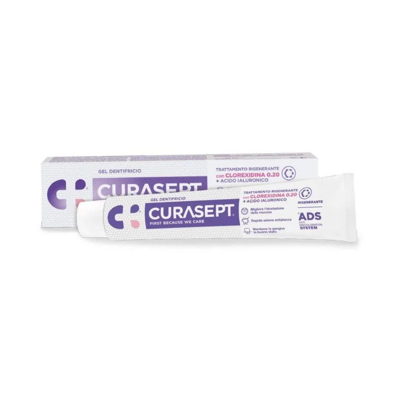 Curasept Gel Dentifricio Ads contiene una formula a base di clorexidina 0,20, acido ialuronico e DNA/RNA vegetale, coadiuvante nei processi rigenerativi della mucosa orale e gengivale.