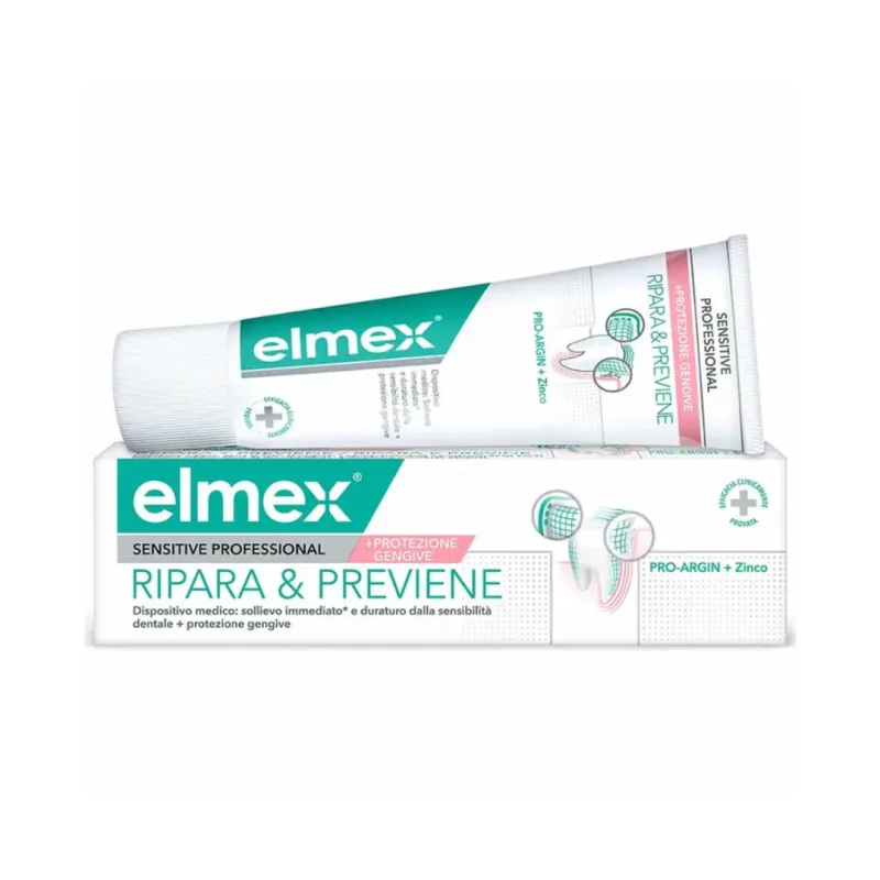 Elmex Sensitive Dentifricio Ripara e Previene è un prodotto per l'igiene orale quotidiana con una duplice funzione e che offre un sollievo immediato dalla sensibilità dentale. La formulazione a base di Pro-Argim sigilla e ripara i tubuli esposti collegati alle terminazioni nervose offrendo da subito sollievo. Con l’utilizzo regolare, forma una barriera protettiva che previene la possibile ulteriore insorgenza di sensibilità. Con l’aggiunta della combinazione di derivati dello zinco, aiuta a rinforzare le gengive e a prevenire la recessione gengivale, agendo su una delle cause principali della sensibilità.