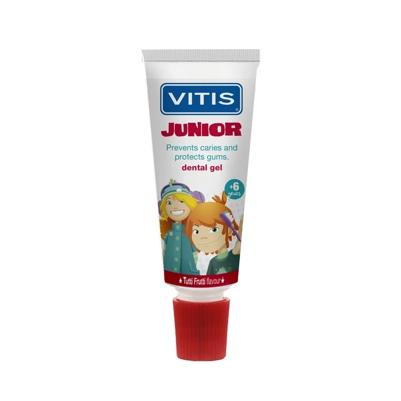 Il dentifricio quotidiano Vitis Junior Gel, dal sapore Tutti Frutti, è stato formulato appositamente per l'igiene orale in questa fase speciale, in cui inizia lo sviluppo della dentizione adulta. La sua formulazione con fluoro, xilitolo e pantenolo, insieme ad una corretta spazzolatura, aiuta ad eliminare la placca dentale (biofilm orale) e detriti alimentari per prevenire la formazione di carie, mentre rimineralizza lo smalto dei denti e cura le gengive nei bambini oltre i 6 anni di età. Allo stesso modo, a causa della sua bassa abrasività non danneggia i denti durante la spazzolatura.