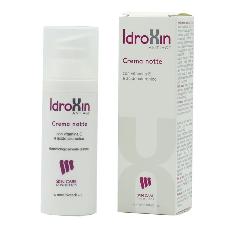 Crema con vitamina E e acido ialuronico. Emulsione multiattiva ricca in vitamina E e acido ialuronico a cessione graduale. Idrata intensamente limitando la perdita di acqua transepidermica e coadiuva la produzione di collagene ed elastina ristrutturando il tessuto cutaneo durante il riposo notturno. Inoltre, grazie al complesso esapeptide-collagene marino, usata regolarmente aiuta a ridurre la visibilità delle rughe rallentandone la comparsa.