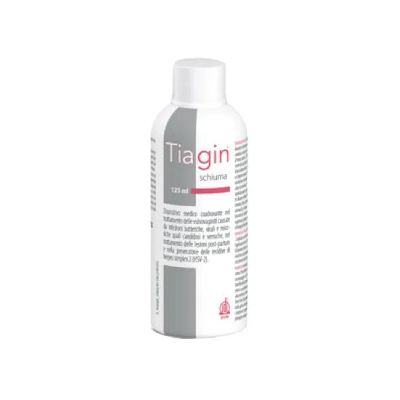Tiagin Schiuma Ginecologica Protettiva è un dispositivo medico formulato per contrastare l'azione di batteri, virus e infezioni nelle zone intime femminili. La schiuma è utile in caso di vulvovaginiti e lesioni post-partum. La schiuma previene anche le recidive di herpes simplex 2. La formulazione contiene estratti di malva, acido ialuronico e "TIAB system "(microcristalli di biossido di titanio conioni argento covalentemente legati). La schiuma svolge una funzione idratante, lenitiva, calmante ed emolliente sulle irritazioni.
