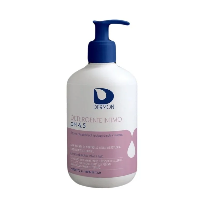Dermon Detergente Intimo pH 4,5 è un prodotto per l'igiene intima quotidiana, adatto all'uso frequente, con azione rigenerante e rinfrescante. La formulazione mantiene in condizioni ottimali la naturale microflora delle zone intime. Il detergente rafforza l'effetto "barriera" nei confronti dei microrganismi potenzialmente dannosi, lasciando una gradevole sensazione di freschezza e pulizia. Con agenti di controllo della microflora, emollienti e lenitivi. Estratto di malva, salvia e tiglio. Studiato per minimizzare il rischio di allergie. Testato per nichel e metalli pesanti. Dermatologicamente testato
