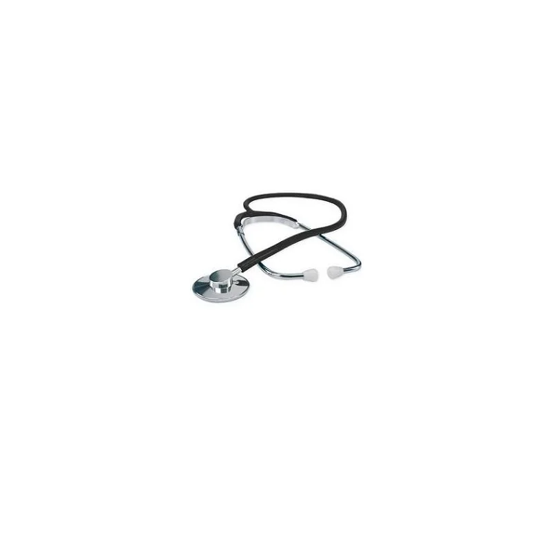 Dispositivo medico CE, classe I.Fonendoscopio con testa piatta di diametro 45 mm e altezza 10 mm, in alluminio anodizzato stampato e tornito. Ghiera filettata per il bloccaggio della membrana. Archetto in metallo cromato: lunghezza 150 mm, diametro 5 mm. Tubo ad Y in PVC in un solo pezzo: diametro 5 mm, lunghezza 60 cm. Colore: nero.
