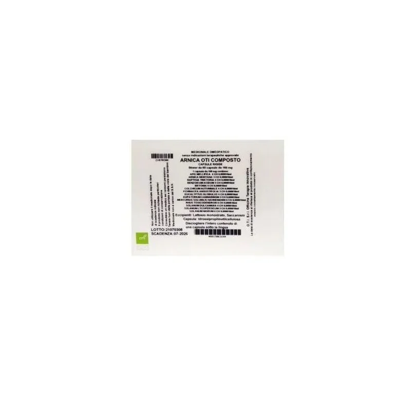 Oti Arnica Composto 60 Capsule è un rimedio omeopatico preparato a partire dall' Arnica, pianta perenne della famiglia delle Composite. La Tintura Madre si prepara a partire dalla pianta intera e contiene flavonoidi a tropismo venoso, pigmenti carotenoidi ad azione antiemorragica, fenoli, lattoni ( tra cui l'elenalina, irritante cutaneo).