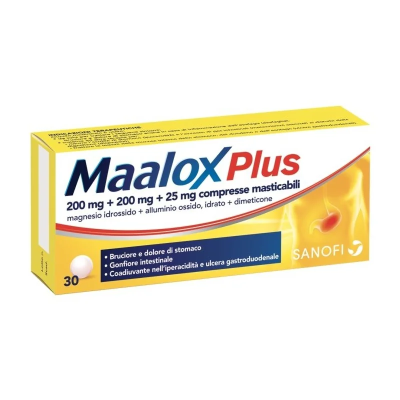 Maalox Plus 200 Mg + 200 Mg + 25 Mg aiuta a ridurre il bruciore di stomaco ed il gonfiore addominale provocato dal reflusso grastico