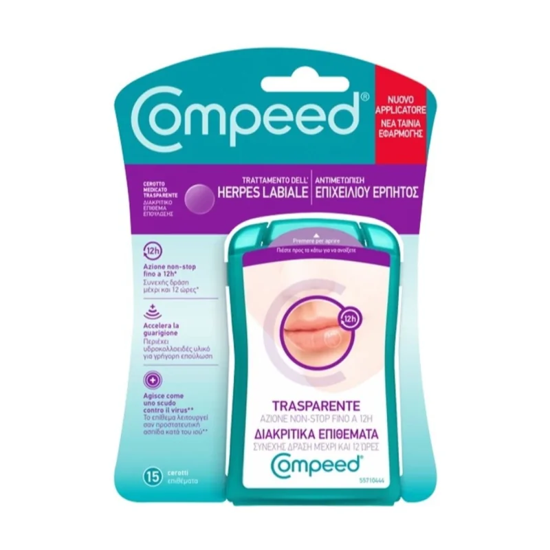 Compeed Trattamento dell'herpes labiale è un cerotto medico trasparente con 12 ore di azione sulla lesione da herpes. Accelera la guarigione.