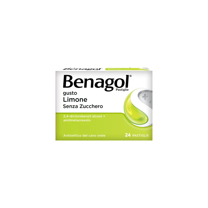- BENAGOL Pastiglie gusto Limone Senza Zucchero, Principi attivi: 2,4–diclorobenzil alcool 1,2 mg; amilmetacresolo 0,6 mg.