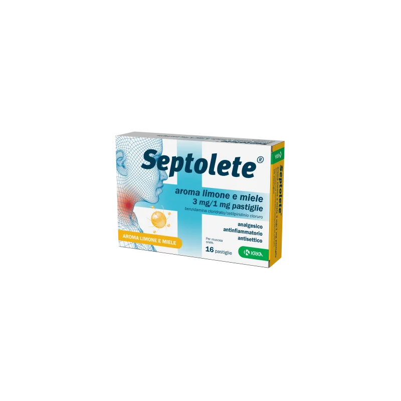 Septolete aroma limone e miele pastiglia è un medicinale antinfiammatorio, analgesico e antisettico per uso orale locale. Septolete aroma limone e miele disinfetta la bocca e la gola e riduce i segni di infiammazione della gola come dolore, arrossamento, gonfiore, calore e funzione alterata.