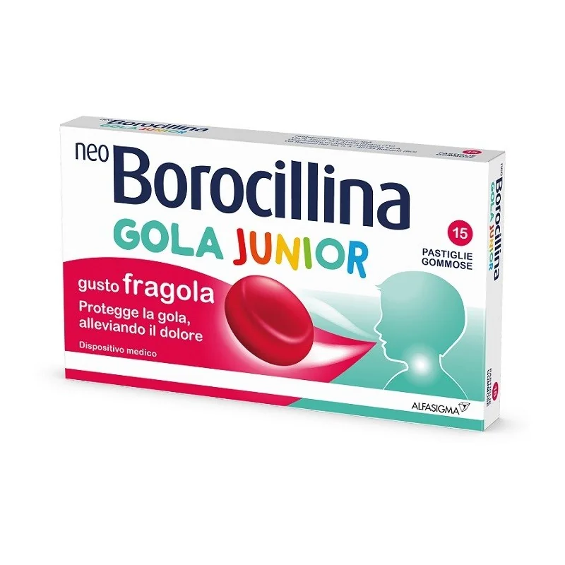 Alfasigma Neoborocillina Gola Junior per trattamento del mal di gola nei bambini dai 6 anni in su. Gusto fragola. Senza glutine e senza lattosio.