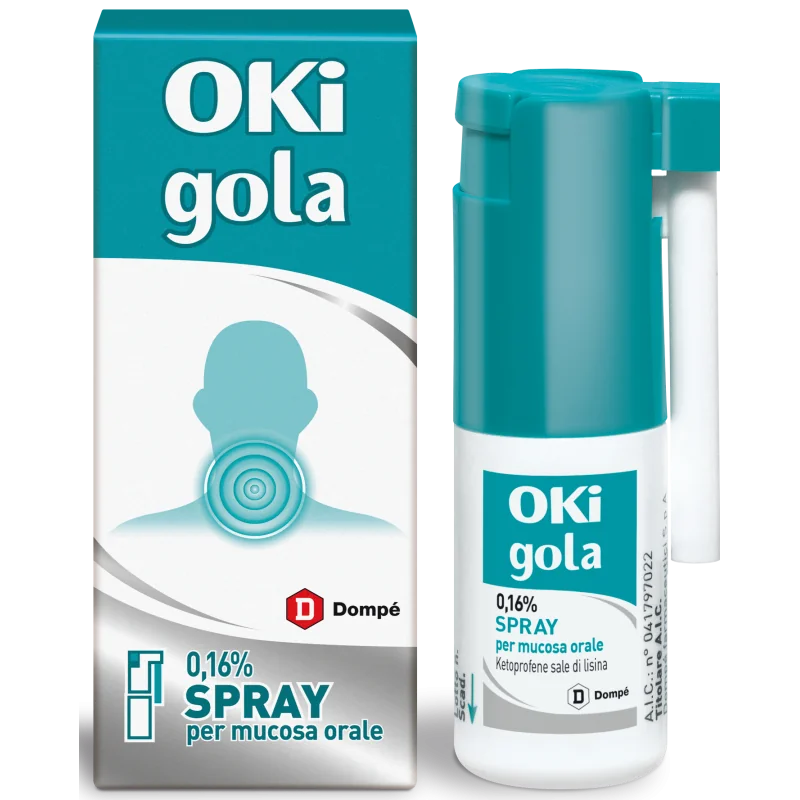 Dompe' Farmaceutici Oki Infiammazione Gola Spray 1,6% contiene come principio attivo ketoprofene sale di lisina, una sostanza che appartiene ad un gruppo di medicinali chiamati “Farmaci Antinfiammatori Non Steroidei” (FANS), ed è un medicinale stomatologico usato per il trattamento locale del cavo orale. OKi gola 1,6% spray si usa per il trattamento sintomatico di stati irritativo - infiammatori anche associati a dolore del cavo oro-faringeo (ad esempio gengiviti, stomatiti, faringiti), anche in conseguenza di terapia dentaria conservativa (cura del dente) o estrattiva(estrazione del dente). Si rivolga al medico se non si sente meglio o se si sente peggio dopo un breve periodo di trattamento.