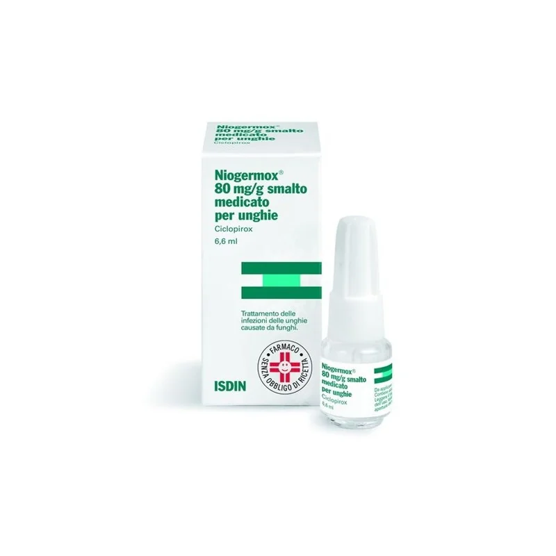 Posologia. Popolazione pediatrica: La sicurezza e l’efficacia di Niogermox nei bambini e adolescenti al di sotto dei 18 anni di età non è stata ancora stabilita. Non ci sono dati disponibili. Modo di somministrazione. Uso cutaneo: Per uso topico sulle unghie delle mani, dei piedi e nelle zone cutanee immediatamente adiacenti (perionichio, iponichio). Salvo diversa prescrizione medica, applicare uno strato sottile di NIOGERMOX una volta al giorno su tutta la superficie, pulita e asciutta, della/e unghia/e malata/e. Applicare lo smalto medicato su tutta la lamina dell’unghia, sui 5 mm circa della cute adiacente e, se possibile, sotto il margine libero dell’unghia. NIOGERMOX asciuga in 30 secondi circa. Non lavare le unghie trattate per almeno sei ore. Si consiglia, pertanto, l'applicazione serale del prodotto, prima di coricarsi. Al termine di questo lasso di tempo, potranno riprendere le normali pratiche igieniche. Per rimuovere NIOGERMOX non necessitano solventi o abrasivi (ad esempio lime per unghie), è sufficiente lavare accuratamente le unghie con acqua. A volte, a causa di un risciacquo incompleto delle unghie, è possibile che dopo alcuni giorni di trattamento, si formi una patina bianca sulla superficie dell’unghia. Per rimuoverlo sarà sufficiente un lavaggio accurato con sapone neutro e, se necessario, con una spugna o uno spazzolino. In caso il prodotto venga inavvertitamente eliminato con un normale lavaggio, ripetere l’applicazione di NIOGERMOX. Si raccomanda di tagliare regolarmente il margine libero dell’unghia e di eliminare tutto il materiale onicolitico. Il trattamento deve essere continuato senza interruzioni fino a quando l’unghia si è rigenerata e la zona colpita è completamente guarita. Normalmente, occorrono 6 mesi di trattamento per le unghie delle mani e da 9 a 12 mesi di trattamento per le unghie dei piedi. La coltura micotica di controllo deve essere effettuata dopo 4 settimane dal termine del trattamento, onde evitare eventuali interferenze sui risultati a causa di residui del principio attivo.Poiché è un trattamento topico, non è necessario l’adattamento della posologia a gruppi specifici di popolazione. In mancanza di risposta alla terapia con NIOGERMOX e/o in presenza di un esteso interessamento di una o diverse unghia delle mani e dei piedi, si deve valutare la possibilità di una terapia supplementare per via orale.