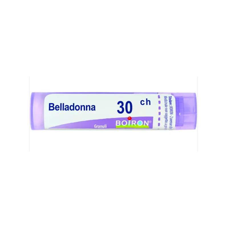 Belladonna Atropa 30ch granuli della Boiron è un rimedio omeopatico a base di Belladonna, una pianta della famiglia delle Solanacee. La Tintura Madre viene preparata a partire dalla pianta intera fiorita; essa è ricca di Atropina, iosciamina e scopolamina, alcaloidi dotati di azione parasimpaticolitica.