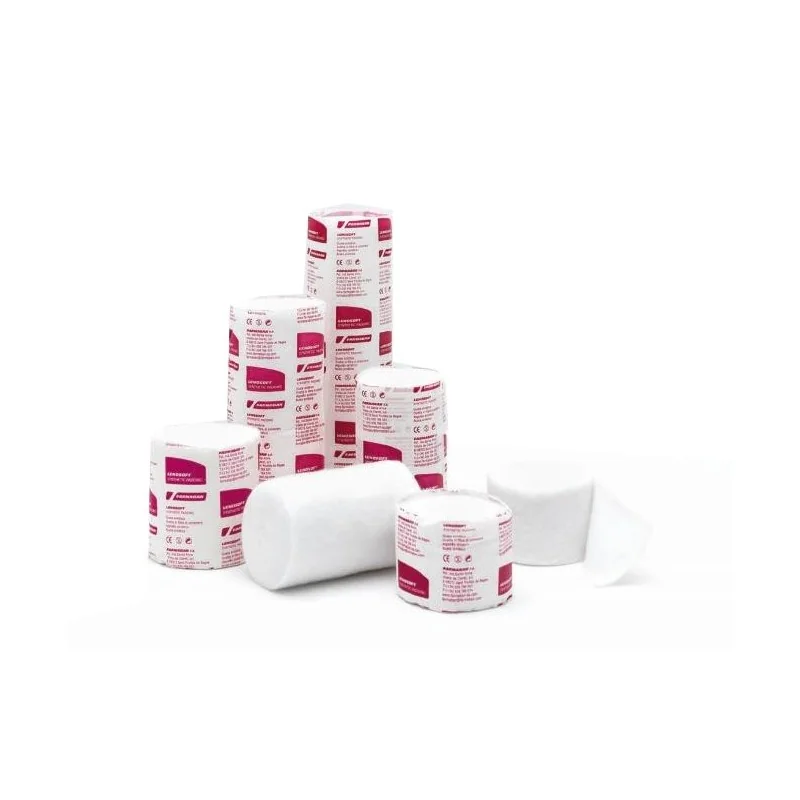 Ovatta sotto gesso sintetica. Materiale per imbottitura e protezione bianco in diverse dimensioni avvolto in involucro di carta. Tessuto non tessuto bianco, non irritante. La massa fibrosa mantiene la spugnosità, l’elasticità che permette una perfetta conformazione e protezione della pelle necessaria a seguito della pressione realizzata dai sistemi di immobilizzazione. La composizione e la resistenza del materiale permettono un’applicazione circolare e la capacità di trazione permette a sua volta di essere apposta in zone particolarmente difficili (gomiti, talloni ecc). La buona proprietà del sintetico Lenosoft non si perde quando si utilizza per un lungo periodo. Per sua naturalezza il materiale presenta un effetto adesivo che facilita l’applicazione richiedendo una semplice manualità. Una volta applicata mantiene uno strato liscio di spessore uniforme che evita punti di pressione che potrebbero creare problemi locali di circolazione. Permeabile all’aria, Lenosoft compensa la temperatura in quanto le fibre non assorbono l’umidità e, nel bendaggio rigido facilita la presa del gesso. Lenosoft non è un prodotto sterile; eliminato l’involucro di carta, può essere sterilizzato in caso necessario a vapore, raggi, ossido di etilene in accordo rispettivamente con le normative EN 554, EN 552, EN 550. Non contiene lattice. Indicato per la protezione delle parti del corpo esposte al gesso oppure ad altri materiali sintetici. Si utilizza anche l’imbottitura per il bendaggio all’ossido di zinco o tape adesivi. Combinata con compresse tessili o compresse di garza di paraffina, Lenosoft agisce come protettore, permeabile all’aria.