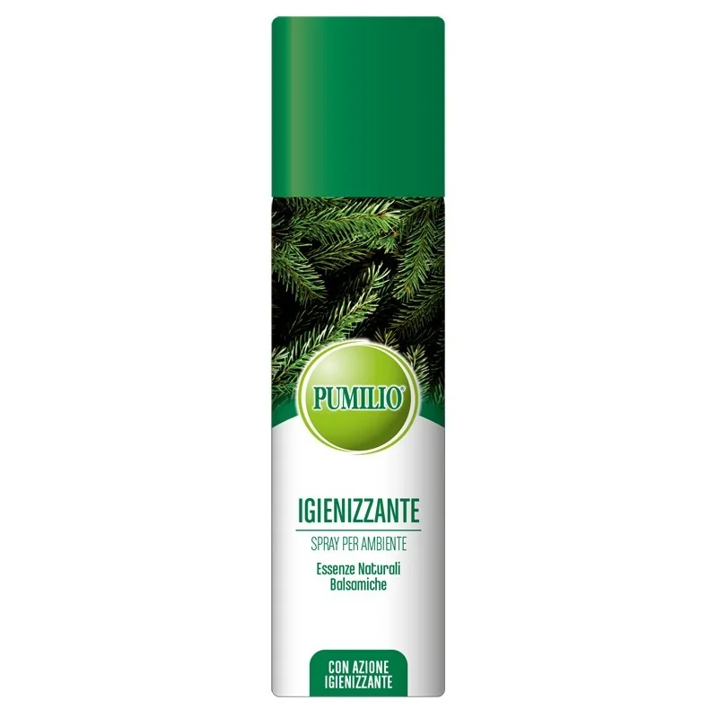 Miscela di olii essenziali concentrati tra cui mentolo, eucalipto, menta arvensis, pino mugo e timo bianco. Contiene benzalconio cloruro, agente antibatterico. Pumilio Spray Igienizzante purifica gli ambienti deodorandoli per ore. Poche nebulizzazioni danno un'immediata sensazione di balsamica freschezza e igienizzano l'ambiente.
