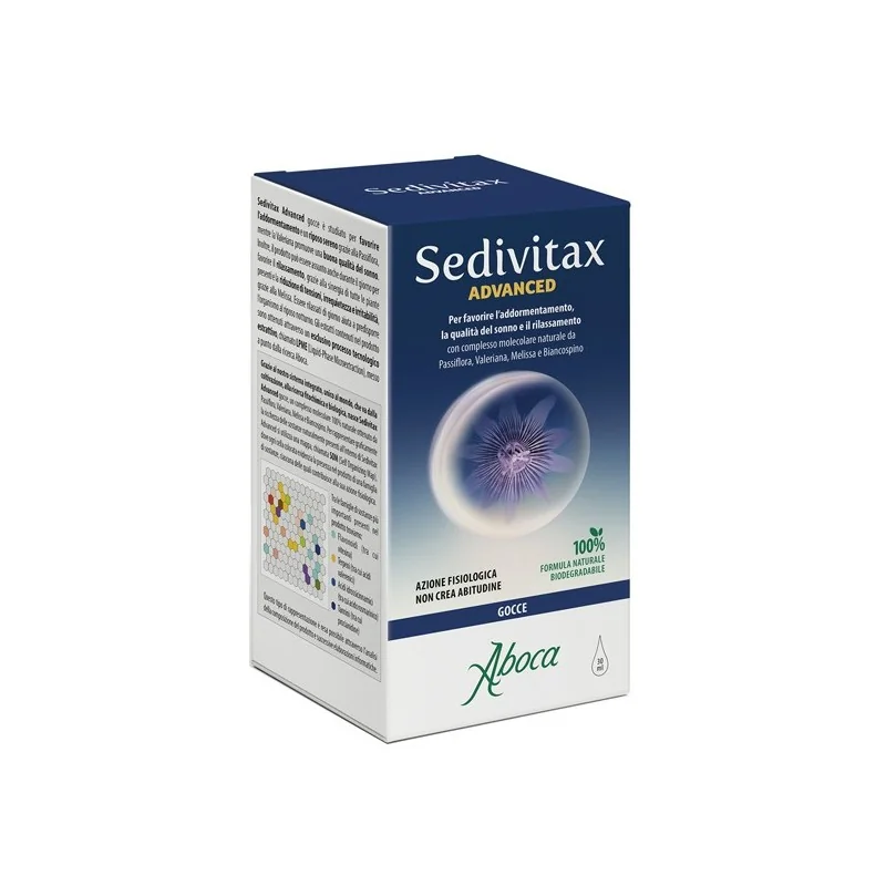 Aboca Sedivitax Advanced è un integratore alimentare 100% naturale e biodegradabile. Grazie al suo complesso molecolare naturale da Passiflora, Valeriana, Melissa e biancospino, ha un'azione fisiologica che non crea abitudine, è efficace e sicuro. Aboca Sedivitax Advanced ha un ampio spettro d'azione, in particolare: