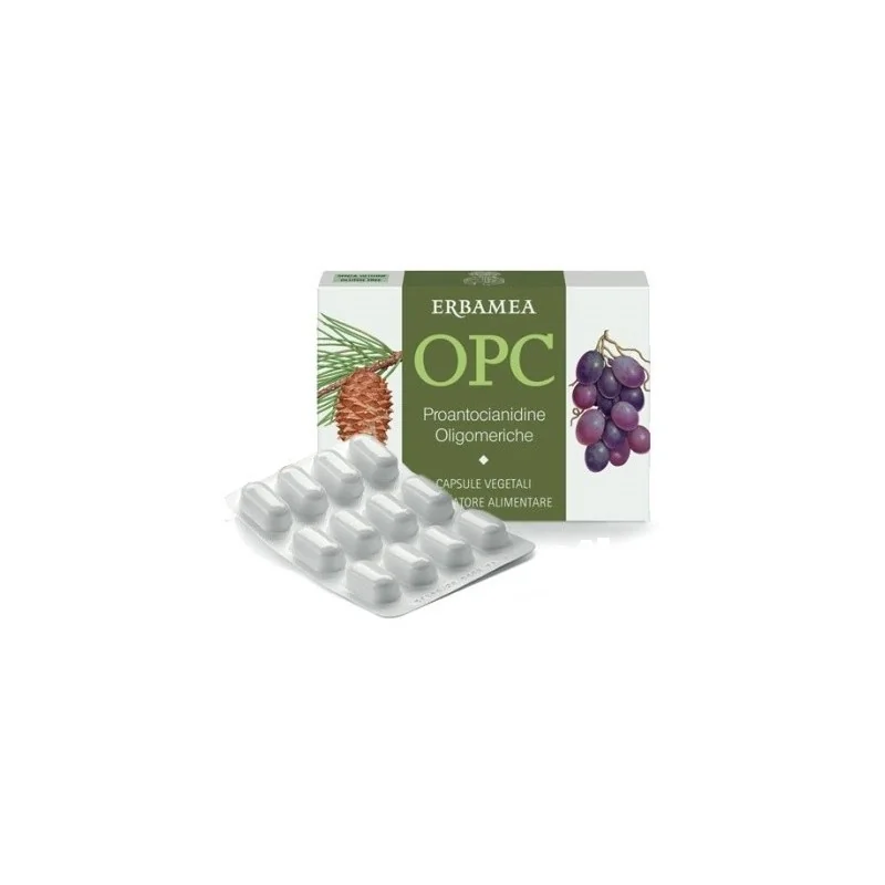 Agente di carica: Fosfato dicalcico, Pino marittimo (Pinus pinaster Aiton) corteccia estratto secco titolato al 95% in Proantocianidine oligomeriche (OPC), Uva (Vitis vinifera L.) semi estratto secco titolato al 95% in Proantocianidine oligomeriche (OPC), Capsula: Idrossipropilmetilcellulosa, Agenti antiagglomeranti: sali di Magnesio degli acidi grassi, Biossido di Silicio.