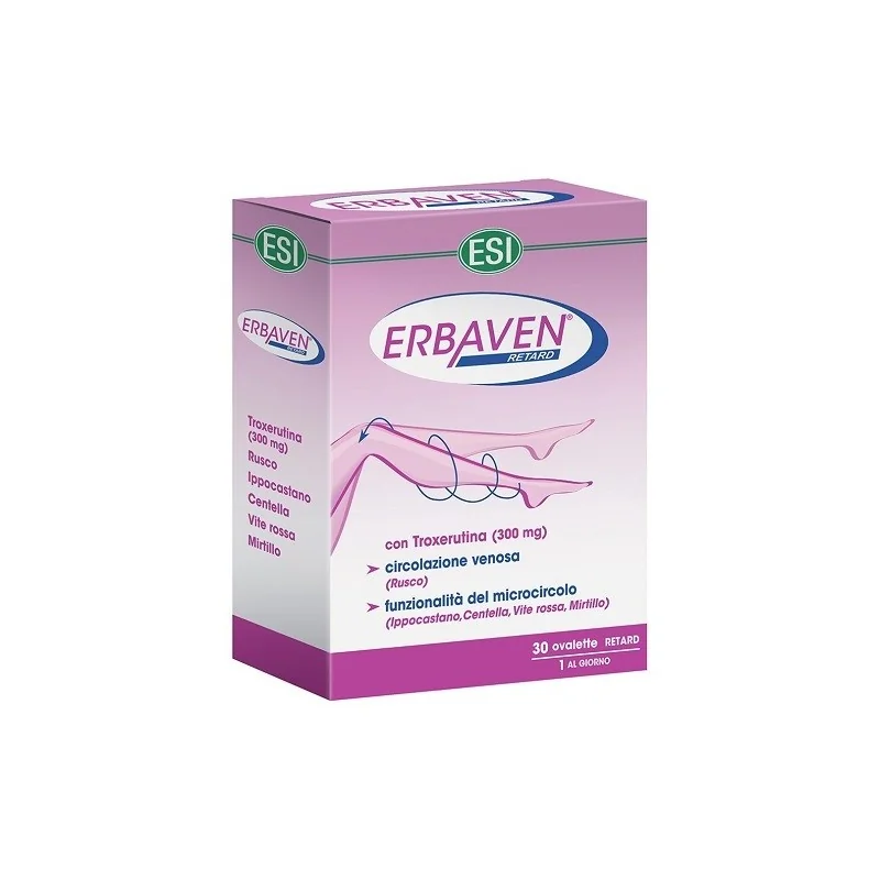 Erbaven Retard è un integratore alimentare a base di Troxerutina ed estratti titolati di ippocastano, vite rossa, centella, rusco e mirtillo. La centella, il rusco, il mirtillo, e la vite rossa favoriscono la funzionalità del microcircolo e sono utili in caso di pesantezza degli arti inferiori. L'ippocastano favorisce la funzionalità del microcircolo. Il rusco inoltre è utile per la funzionalità della circolazione venosa e del plesso emorroidario. La speciale formulazione consente una graduale disaggregazione dell'ovaletta lungo il tratto gastro enterico.