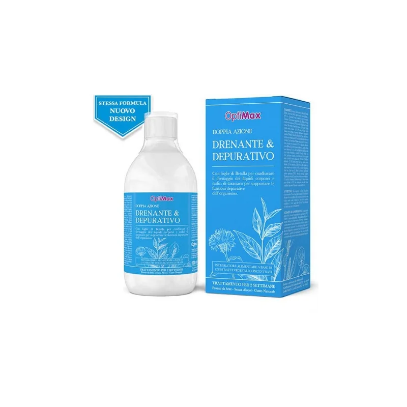 OPTIMAX Drenante & Depurativo Doppia Azione racchiude in una preziosa formulazione e proprietà drenanti e depurative costituendo così un valido aiuto per favorire il fisiologico drenaggio dei liquidi corporei (betulla) e le funzioni depurative dell'organismo (tarassaco).