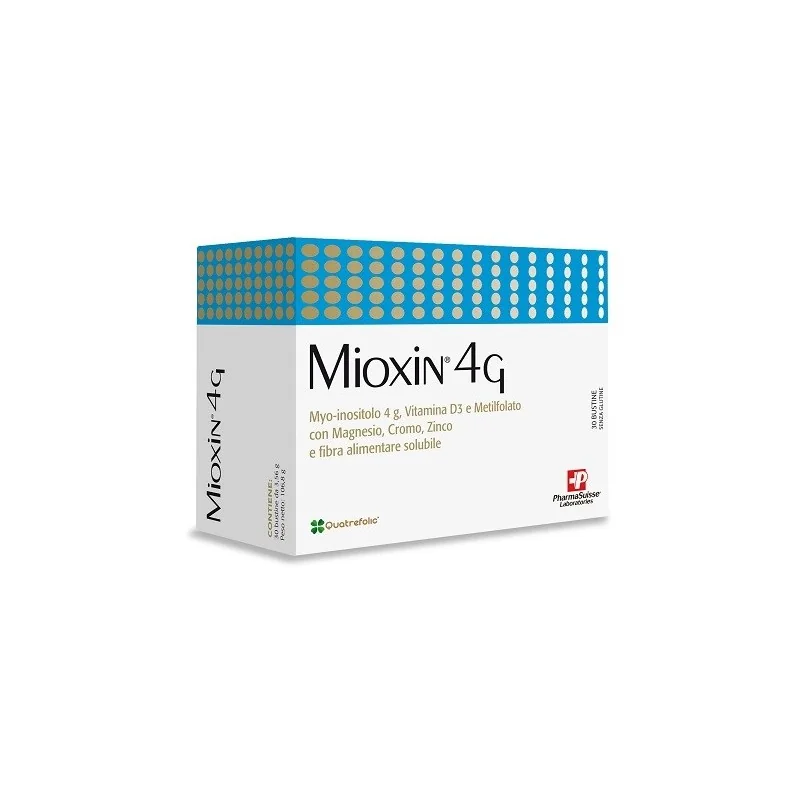 Integratore alimentare a base di Myo-inositolo, vitamina D3, metilfolato, magnesio, zinco e cromo, con fibra alimentare solubile, utile in caso di ridotto apporto con la dieta o aumentato fabbisogno di tali nutrienti. Il magnesio contribuisce al normale metabolismo energetico e alla normale funzione muscolare. Lo zinco contribuisce al normale metabolismo dei carboidrati. Il cromo contribuisce al normale metabolismo dei macronutrienti e al mantenimento di livelli normali di glucosio nel sangue. La vitamina D e l'acido folico intervengono nel processo di divisione delle cellule. L'assunzione integrativa di Acido folico aumenta lo stato del folato materno. Un basso stato del folato materno è un fattore di rischio per lo sviluppo di difetti del tubo neurale nel feto. Mioxin 4G contiene Quatrefolic, Acido folico in forma biologicamente attiva (Metilfolato).